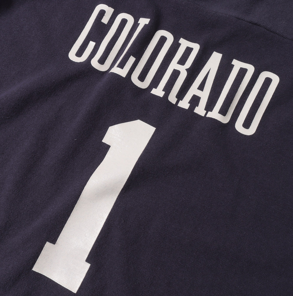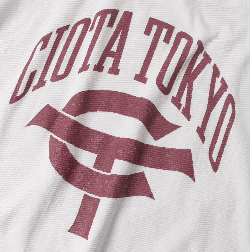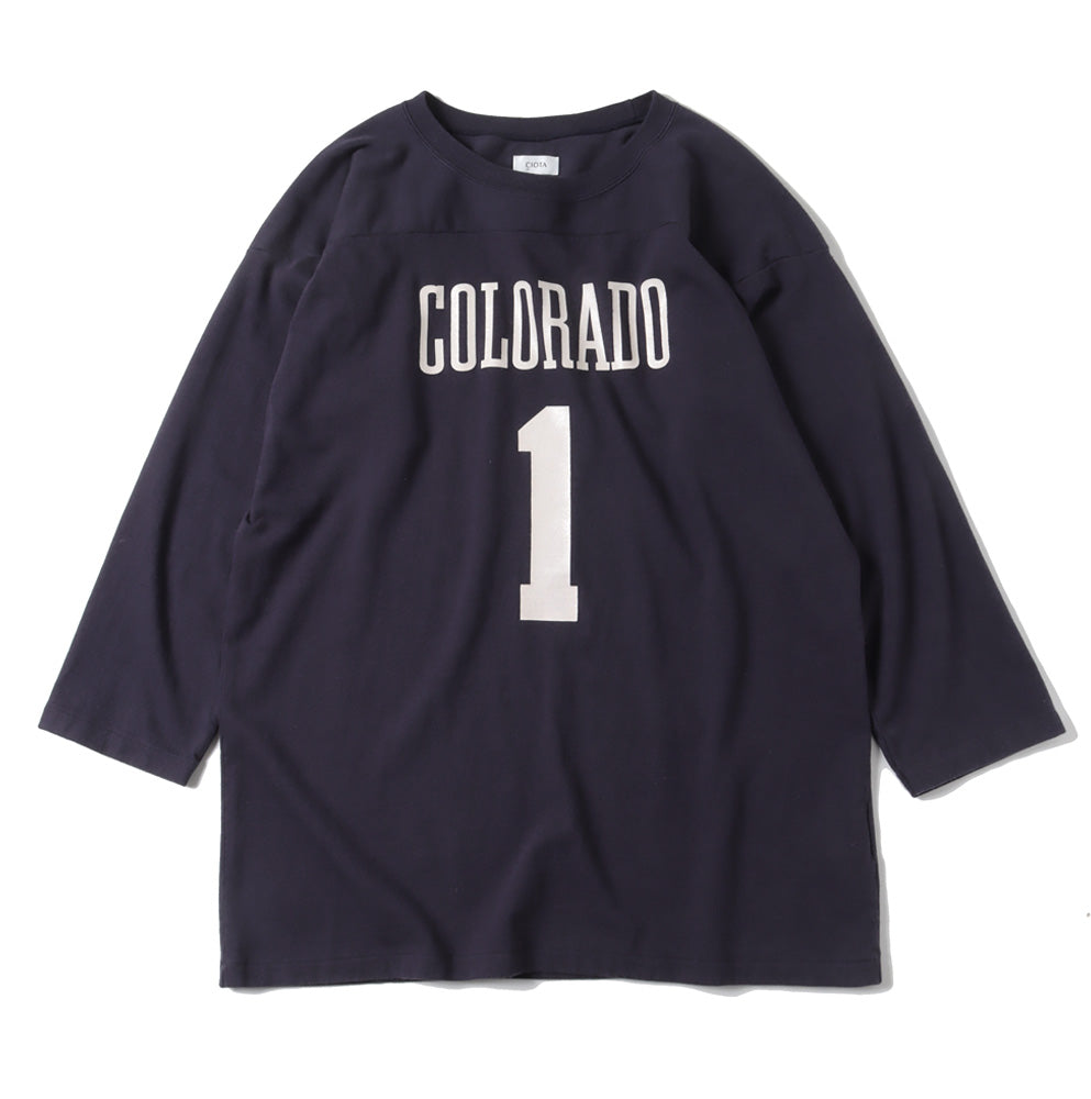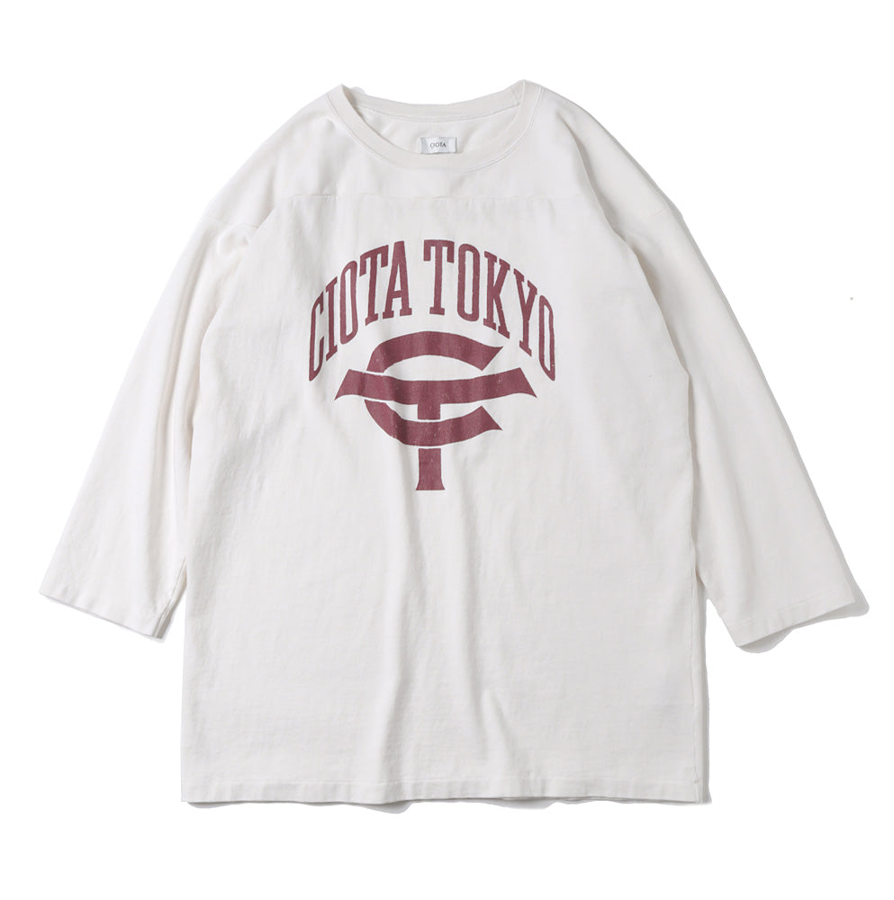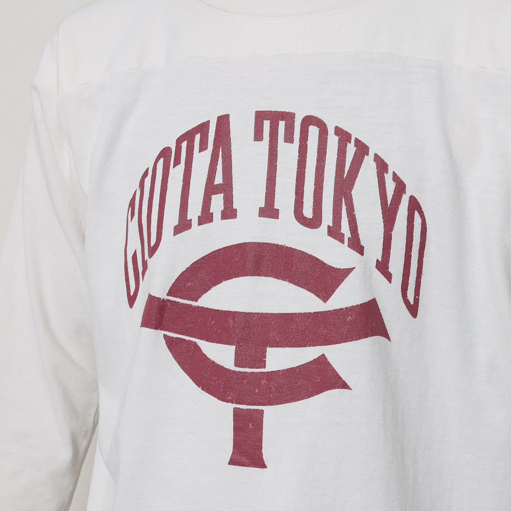 スビンコットンの中でもとりわけ希少性の高い“スビン ゴールド”を使ってフットボールTシャツを作りました。デザインは1970年代のヴィンテージをサンプリグしています。スビンゴールドの特性である、シルクのような光沢とカシミヤのような肌触りを最大限に活かすならば、毛羽立ちを抑えるコーミング加工を施すのが一般的ですが、こちらはナチュラルな風合いを残したカード糸。太さは12番手で、スラブ糸(フシのある糸)を使用することで、ラフな表情に仕上げました。それでもスビンコットンの滑らかなタッチは十分に体感いただけます。