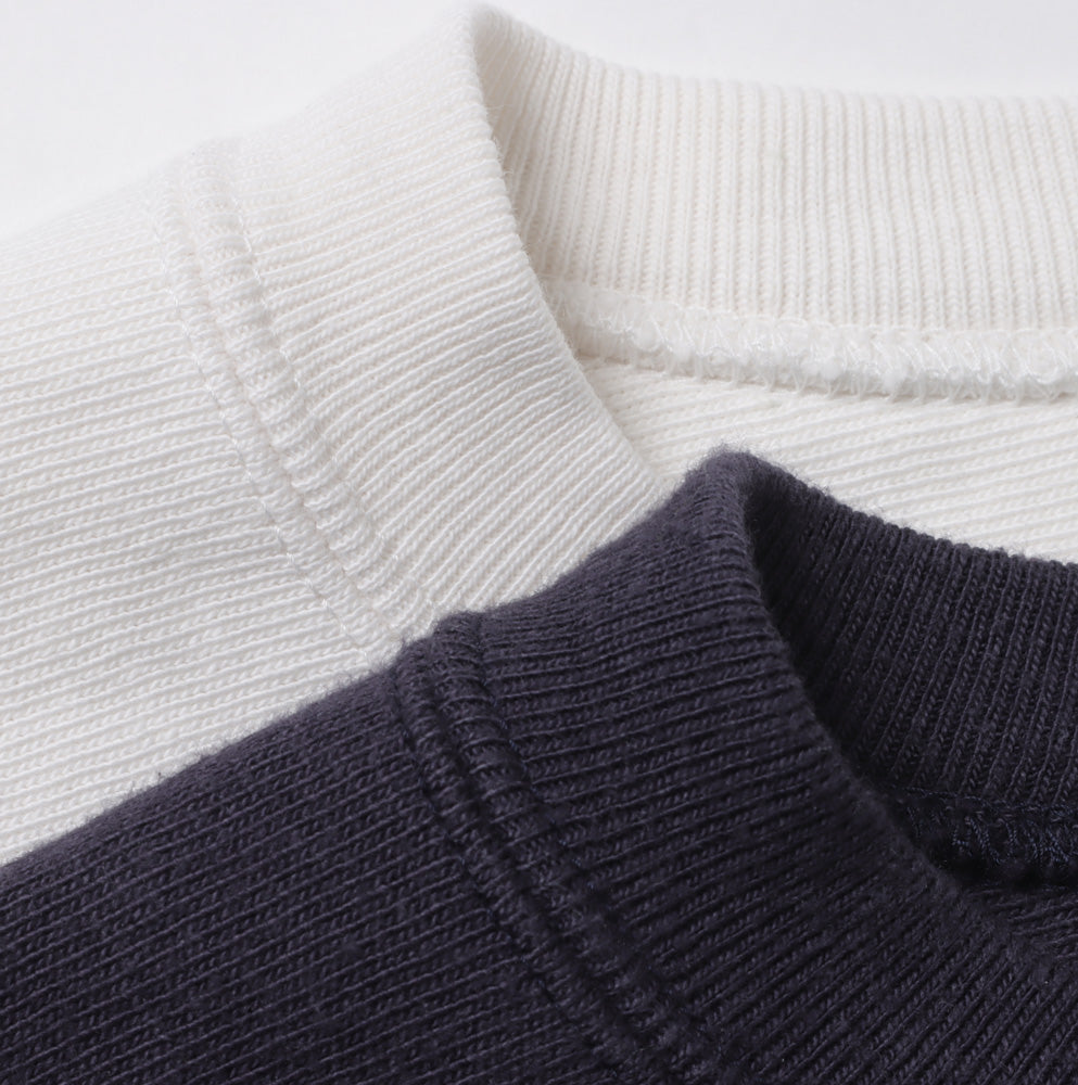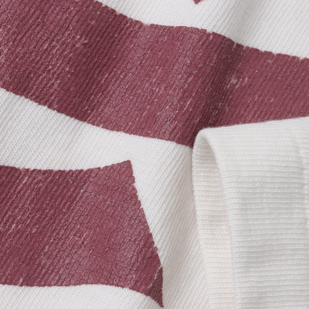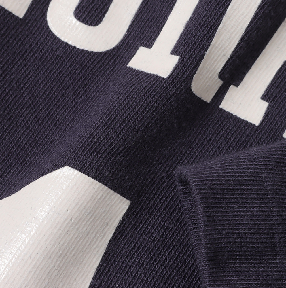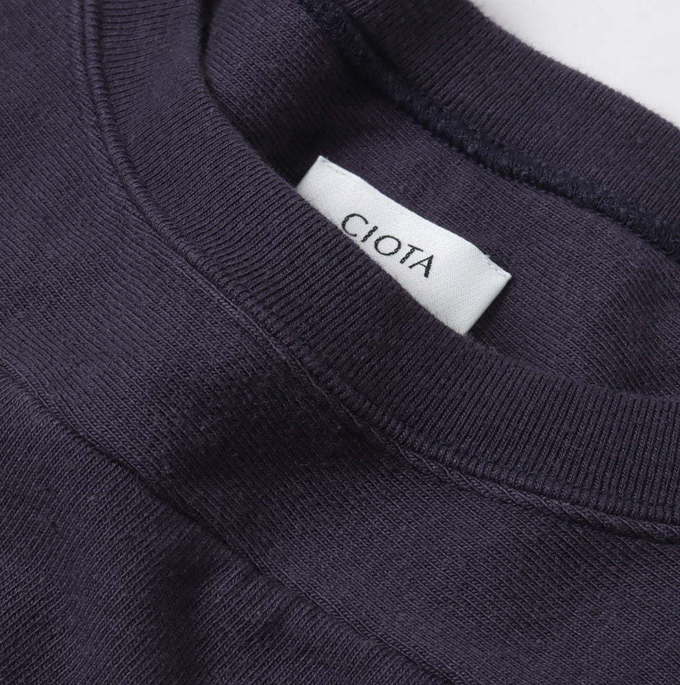 スビンコットンの中でもとりわけ希少性の高い“スビン ゴールド”を使ってフットボールTシャツを作りました。デザインは1970年代のヴィンテージをサンプリグしています。スビンゴールドの特性である、シルクのような光沢とカシミヤのような肌触りを最大限に活かすならば、毛羽立ちを抑えるコーミング加工を施すのが一般的ですが、こちらはナチュラルな風合いを残したカード糸。太さは12番手で、スラブ糸(フシのある糸)を使用することで、ラフな表情に仕上げました。それでもスビンコットンの滑らかなタッチは十分に体感いただけます。