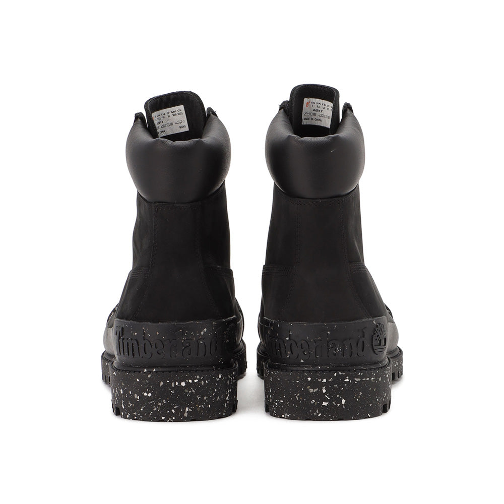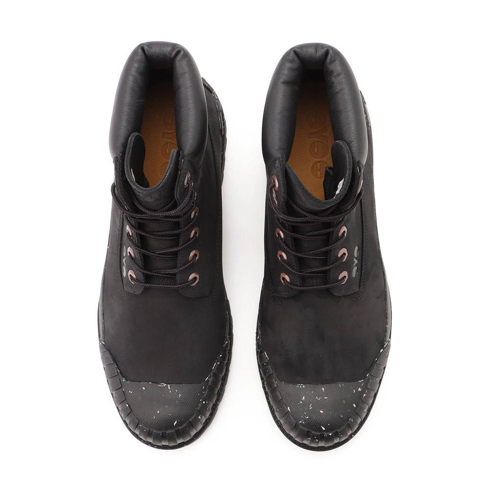 初めてコラボレーションした「6インチ プレミアム ウォータープルーフ ブーツ(通称:イエローブーツ)」 「6インチ ウォータープルーフ ラバートゥ ブーツ 」と名付けられた今作は、 アッパーからシューレースまで全体をブラックのワントーンでまとめ上げ、ラバートゥ仕様にアップデートしたアウトソールには、環境に配慮したリサイクルラバーを使用することで、混合物がスプラッターペイントを施したかのような見た目に仕上がっています。そして、アイレットがアンティーク調の風合いとなっているほか、クォーターパネルにアッパーと同系色のブラックで「アイ ジュンヤ ワタナベ マン」のロゴをさりげなくあしらい、ヒールのラバー部分にはティンバーランド」のロゴをエンボス加工でデザイン。さらに、インソールとハングタグが両者のダブルネーム仕様となり、「オリジナルイエローブーツ」を彷彿とさせるイエローのシューレスも付属します。